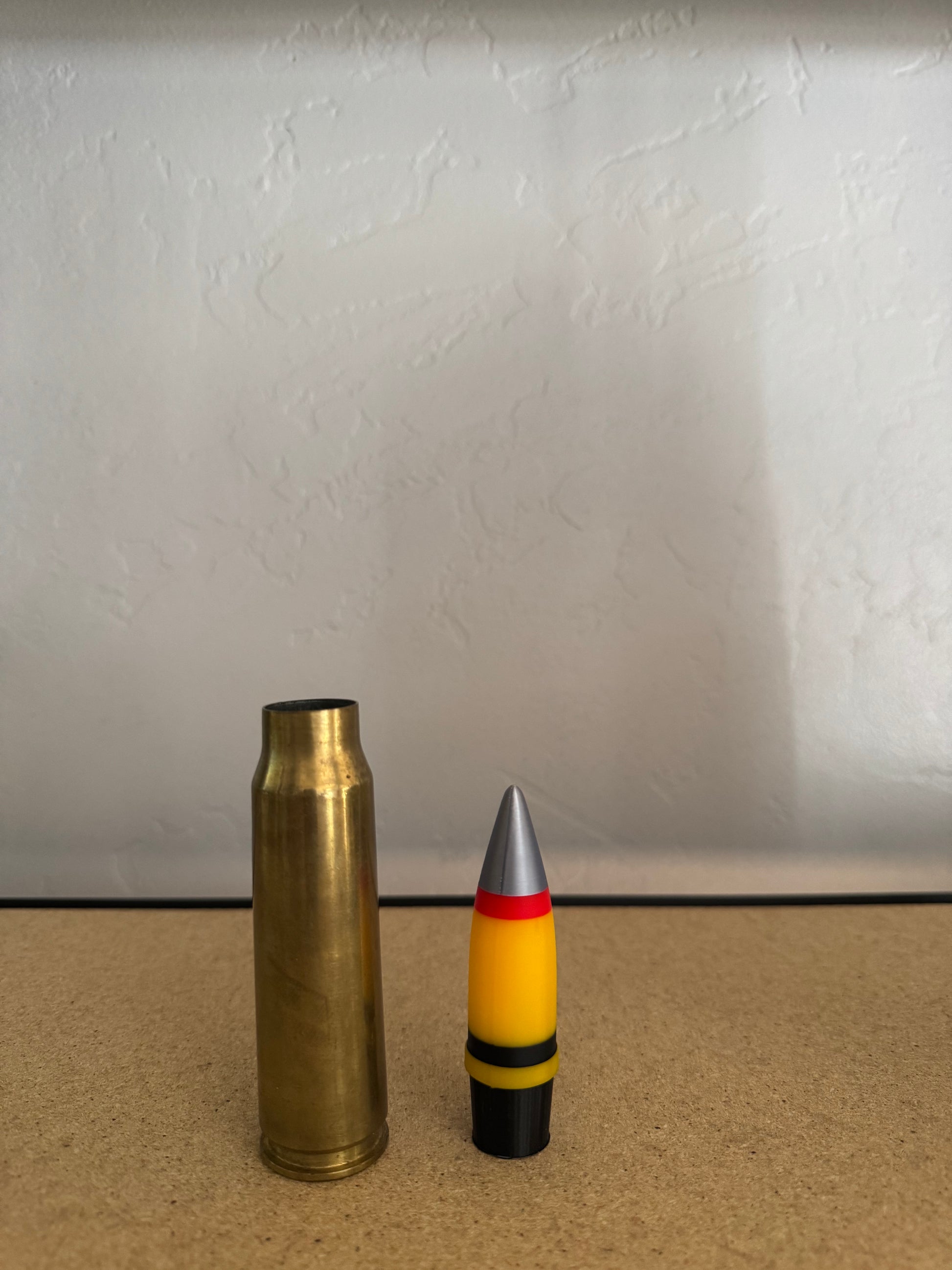 This 1:1 scale 20mm tip is a life-size, 3D-printed inert component designed to fit perfectly in brass casings or display mounts. The tip is printed to accurate dimensions for a snug fit and realistic appearance.