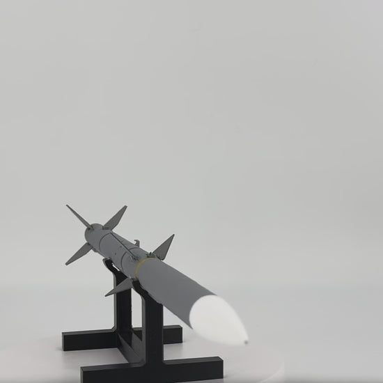 This AIM-120 is a 1:14 scale, 3D-printed inert replica modeled for realistic shape and proportion. Each piece is printed in light grey and includes a Y-stand in black or green for stable display on desks, shelves, or workbenches.