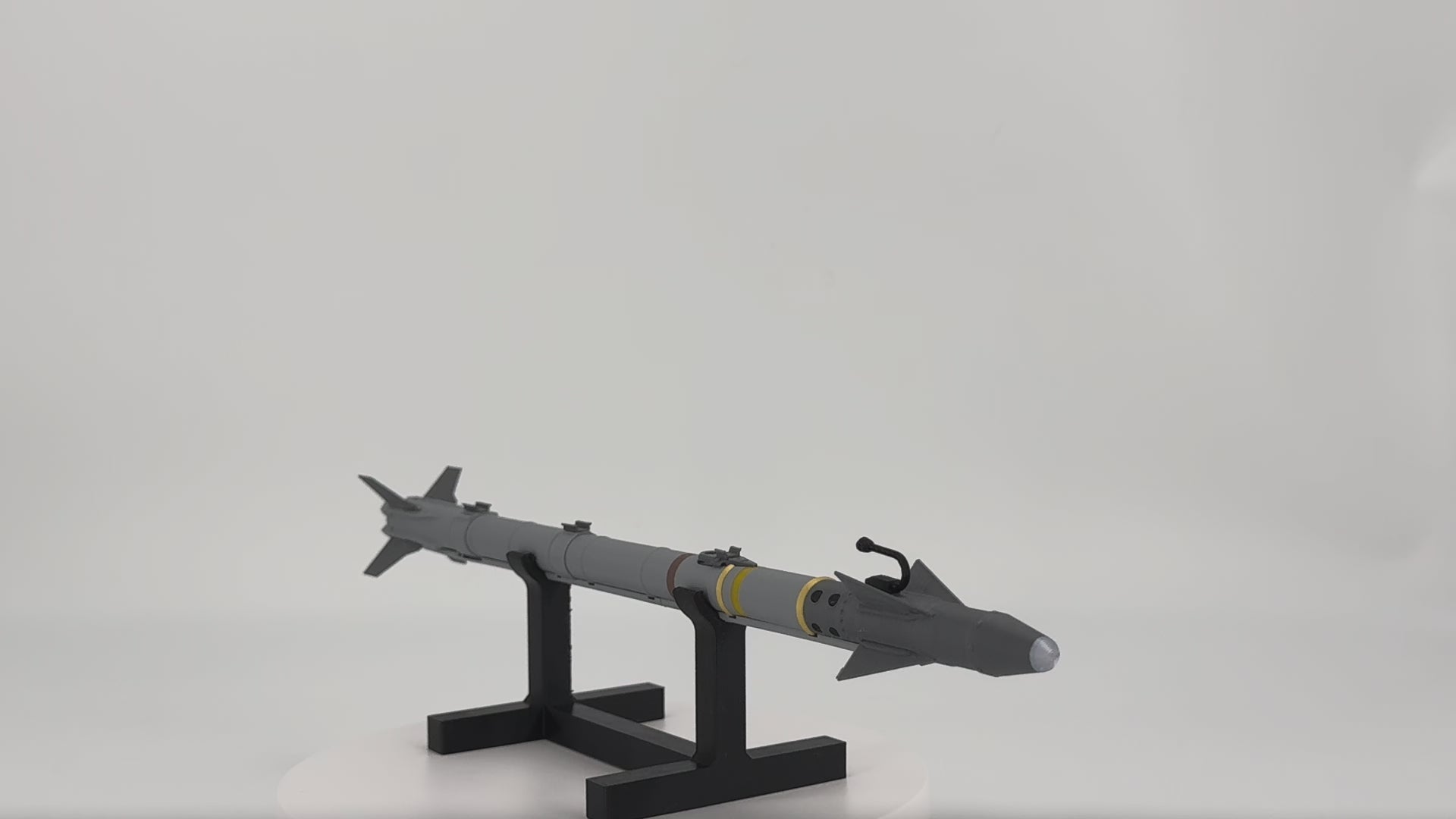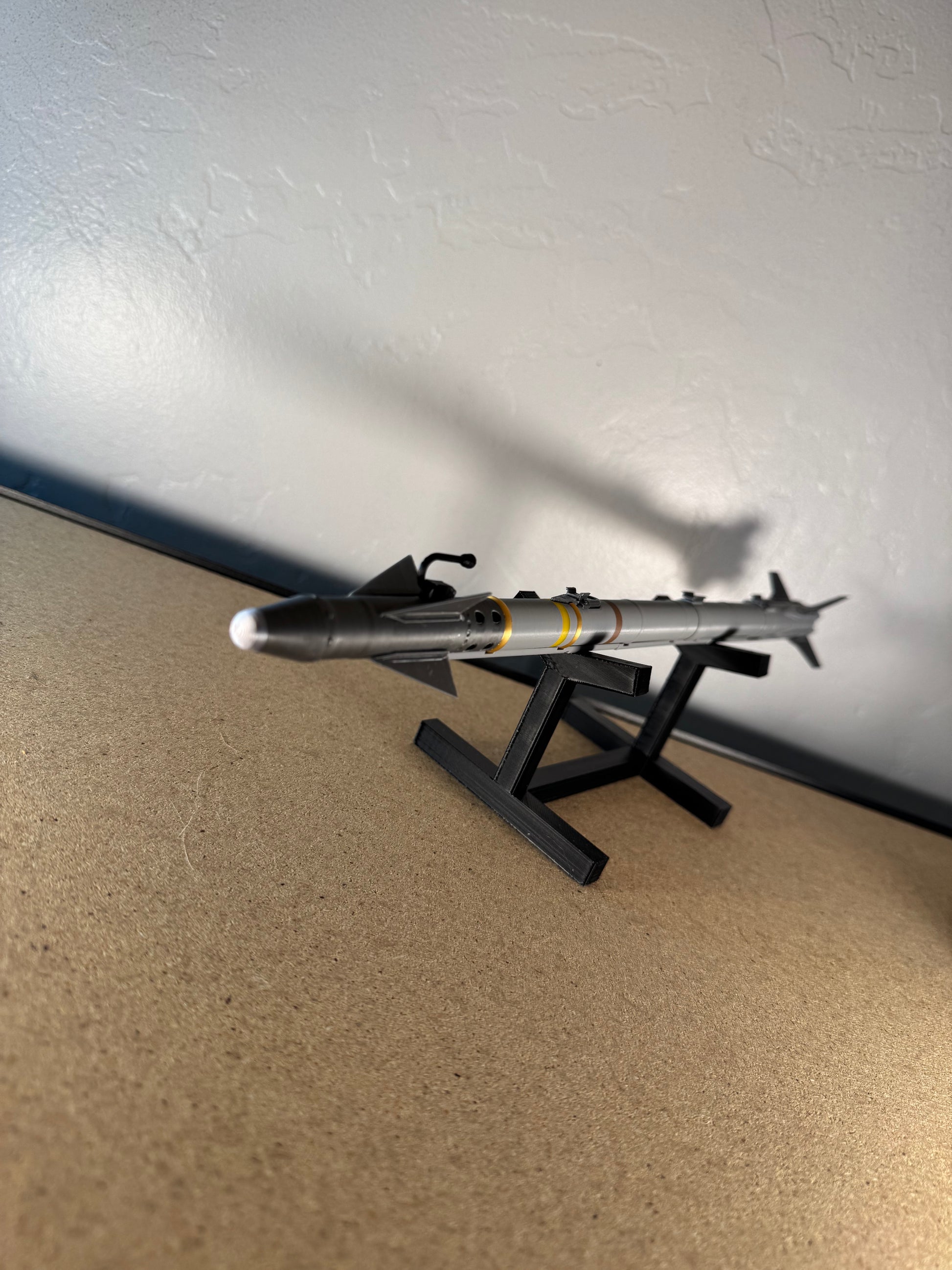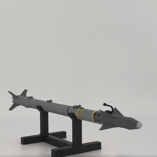 This 12.5-inch AIM-9X is a 1:14 scale 3D-printed inert replica designed for display. Each model is printed in light grey for a realistic appearance and includes a Y-stand in black or green for stable placement on desks, shelves, or workbenches.